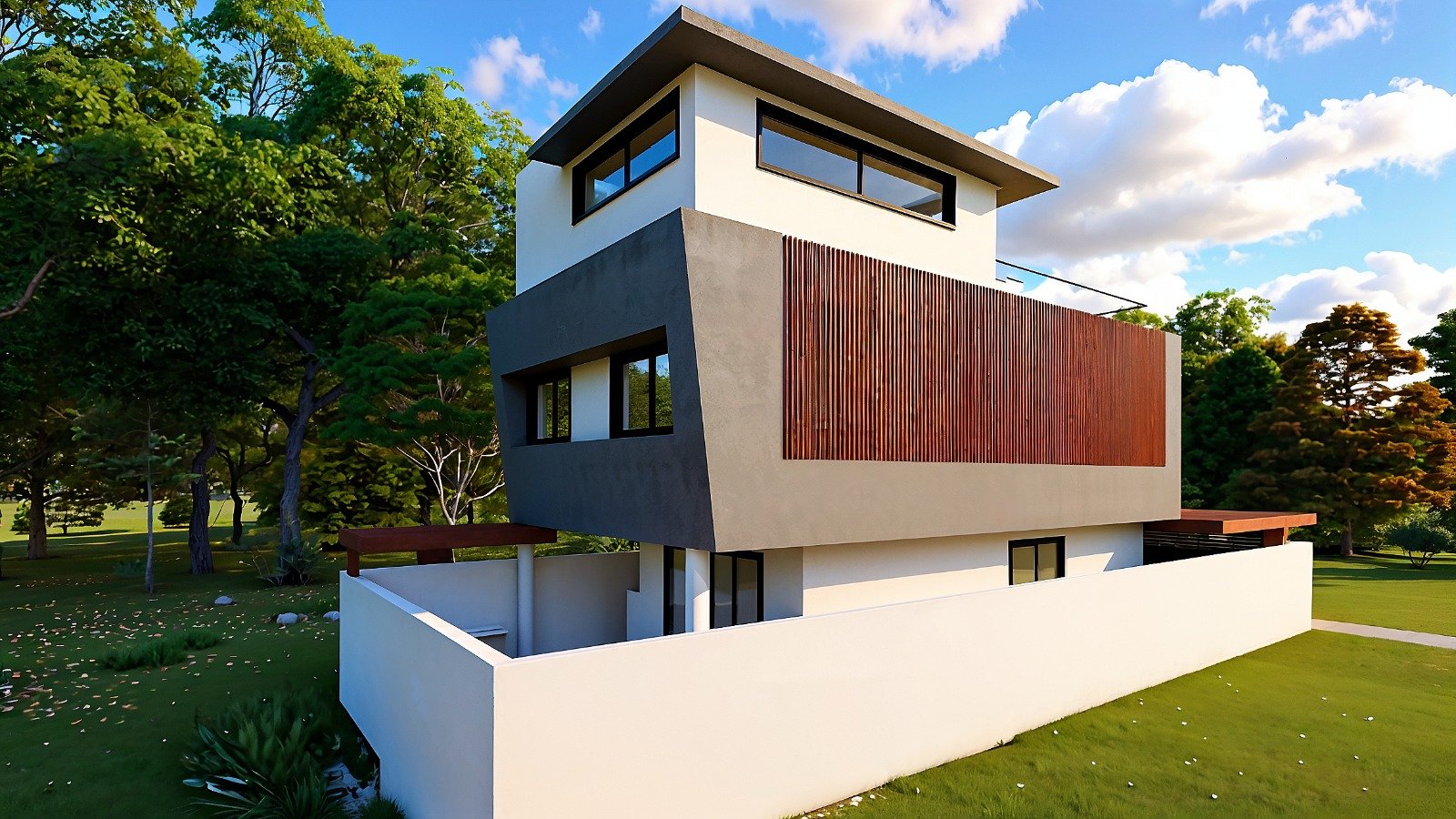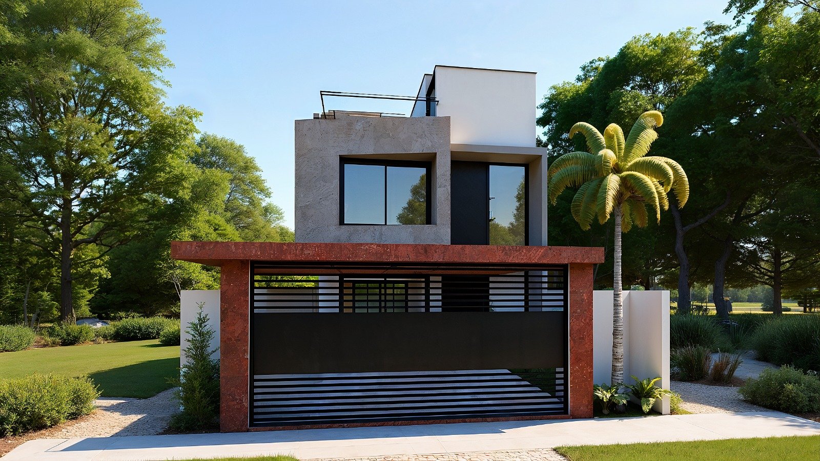 Com volumes geométricos e contrastes de materiais, esta casa se destaca pela imponência e elegância contemporânea. O tom avermelhado da pedra traz personalidade, enquanto o preto e o branco equilibram a composição. Uma fachada que traduz modernidade sem perder a conexão com a natureza ao redor.