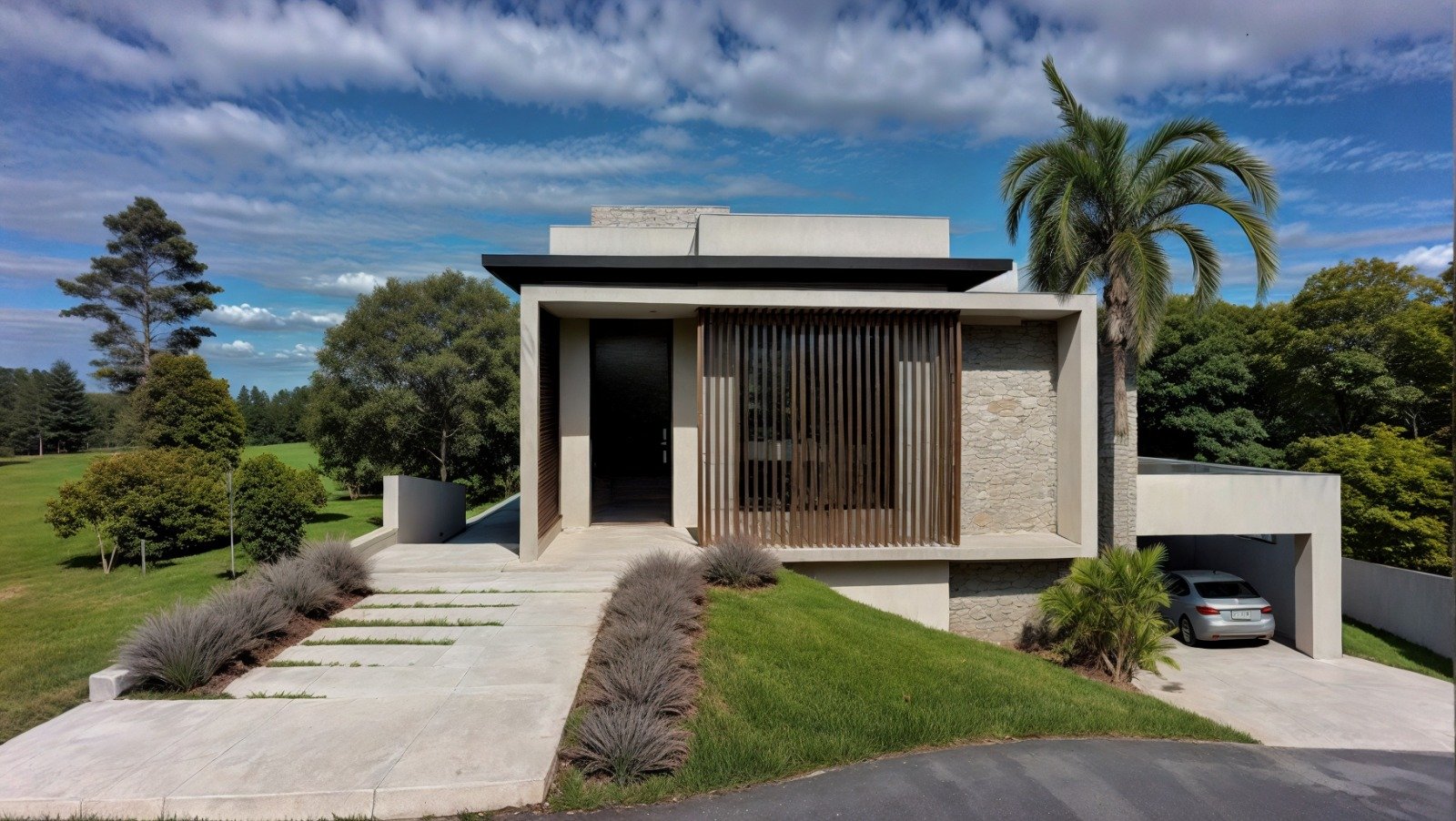 Entre linhas retas e a força da pedra, esta residência traduz equilíbrio e sofisticação. A fachada valoriza a integração entre o contemporâneo e o natural, criando uma presença marcante no terreno, mas que ainda conversa com a paisagem ao redor. Cada detalhe — do brise à textura das paredes — foi pensado para unir beleza, funcionalidade e acolhimento.