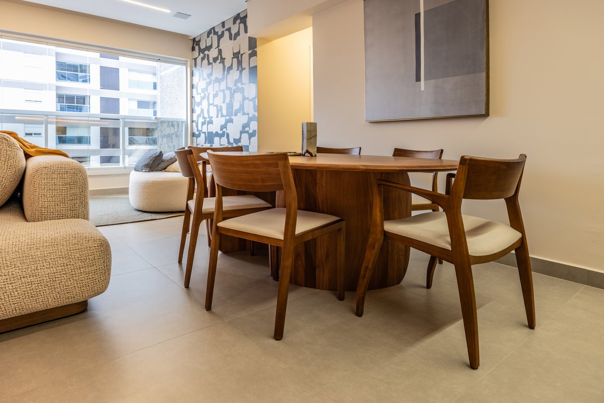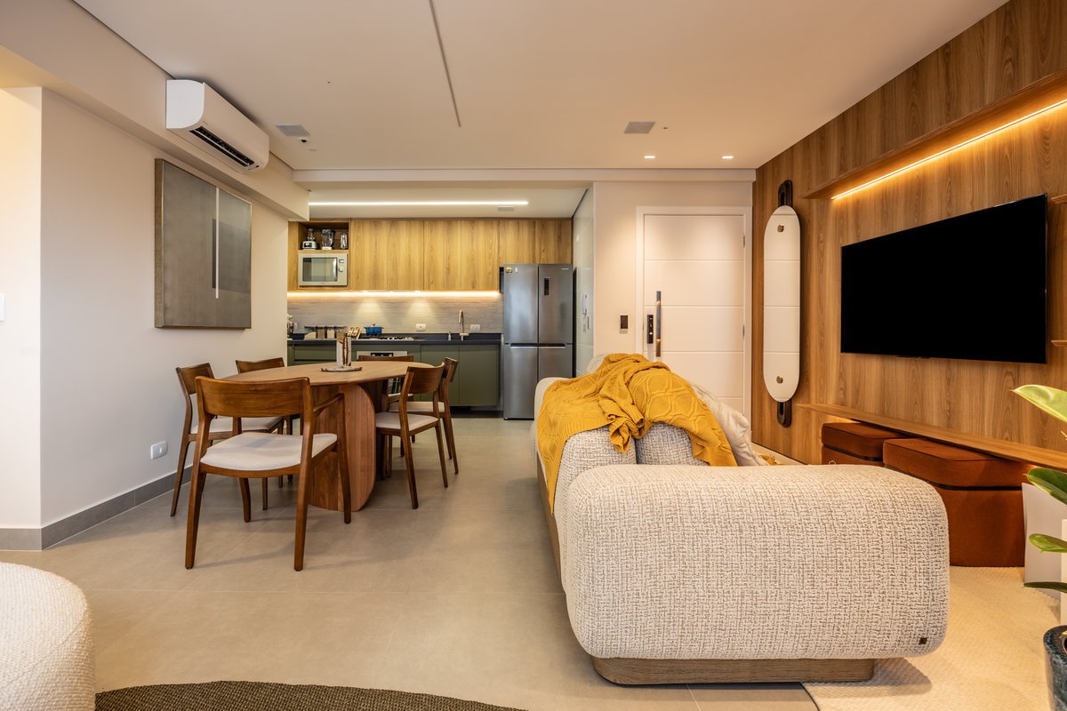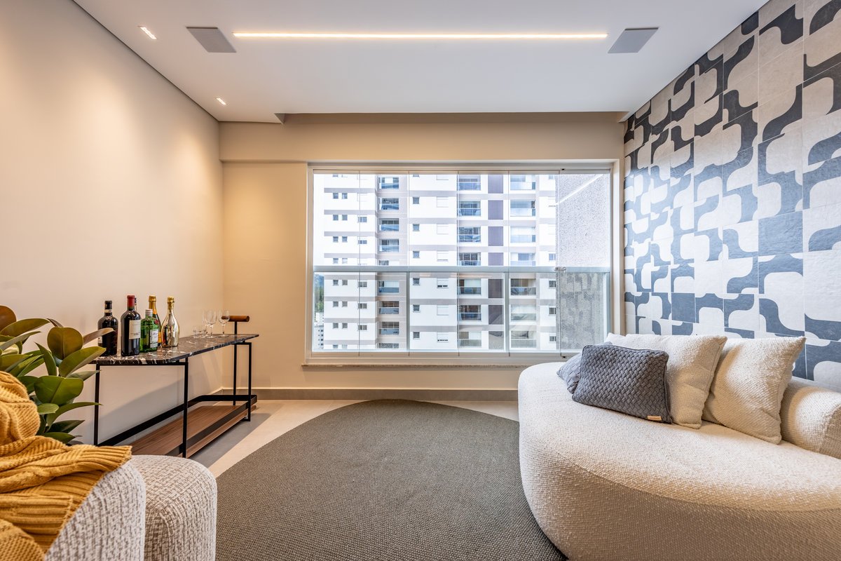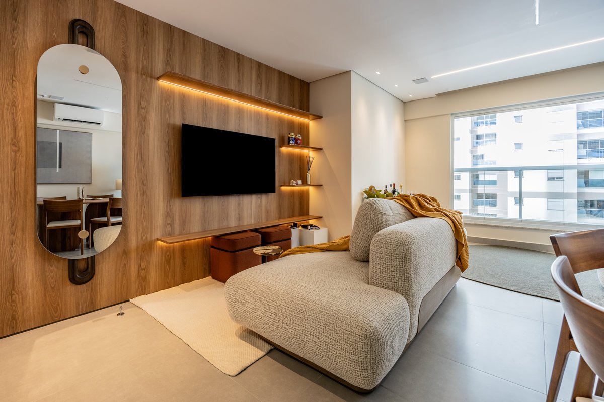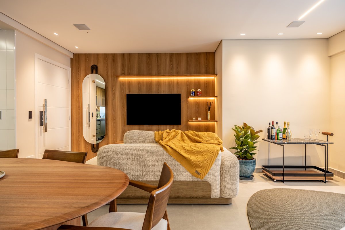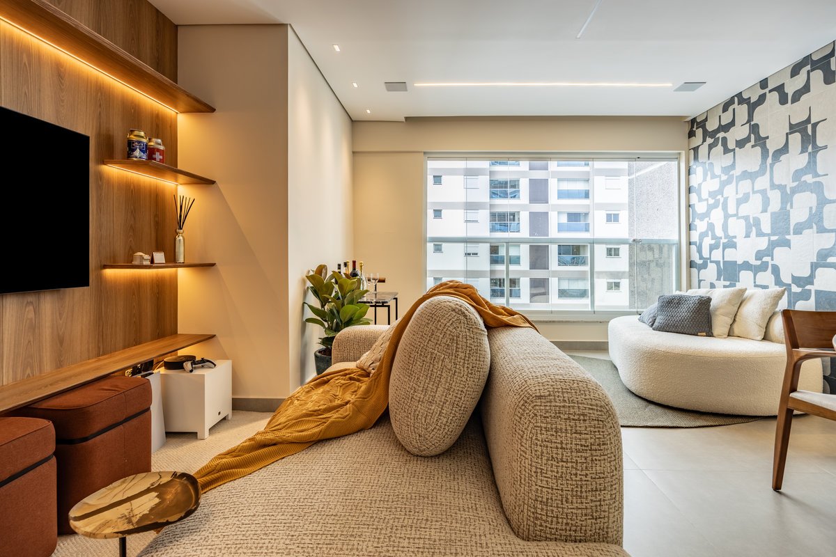 A marcenaria sob medida, com iluminação embutida, organiza sem pesar. Já os estofados generosos e de linhas curvas convidam ao relaxamento e à convivência a dois — seja para maratonar séries ou receber amigos. O painel com estampa geométrica quebra a monotonia com um toque contemporâneo e ousado, sem deixar de lado a elegância. O equilíbrio entre design e funcionalidade é o fio condutor desse refúgio urbano feito sob medida para quem valoriza bem-estar e estilo.