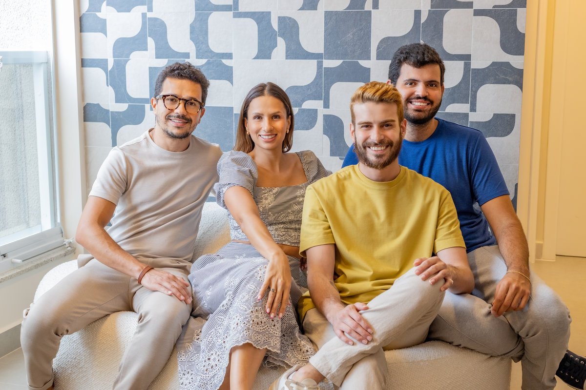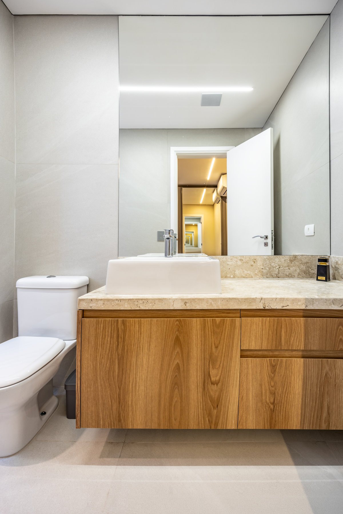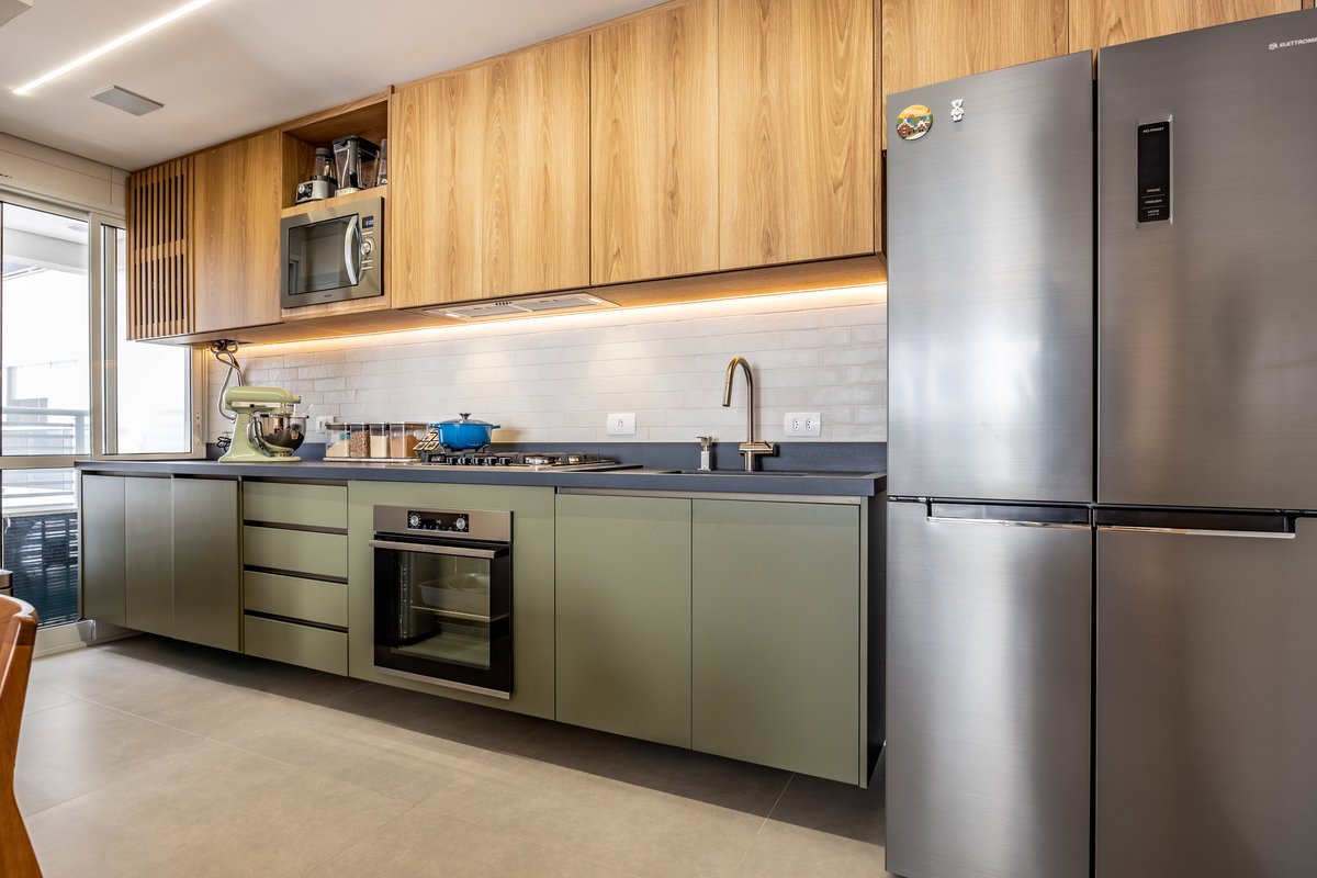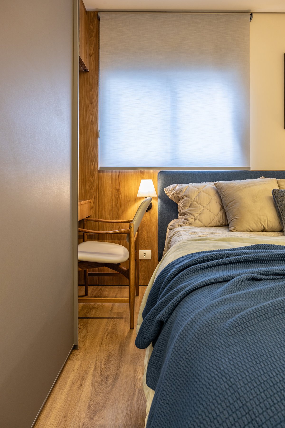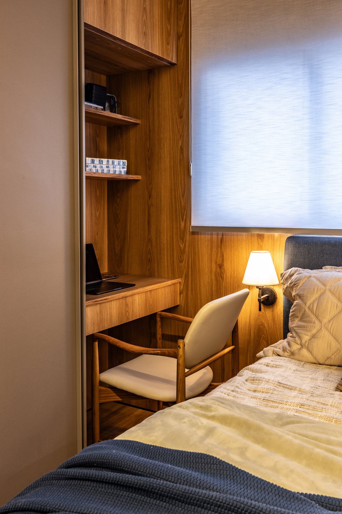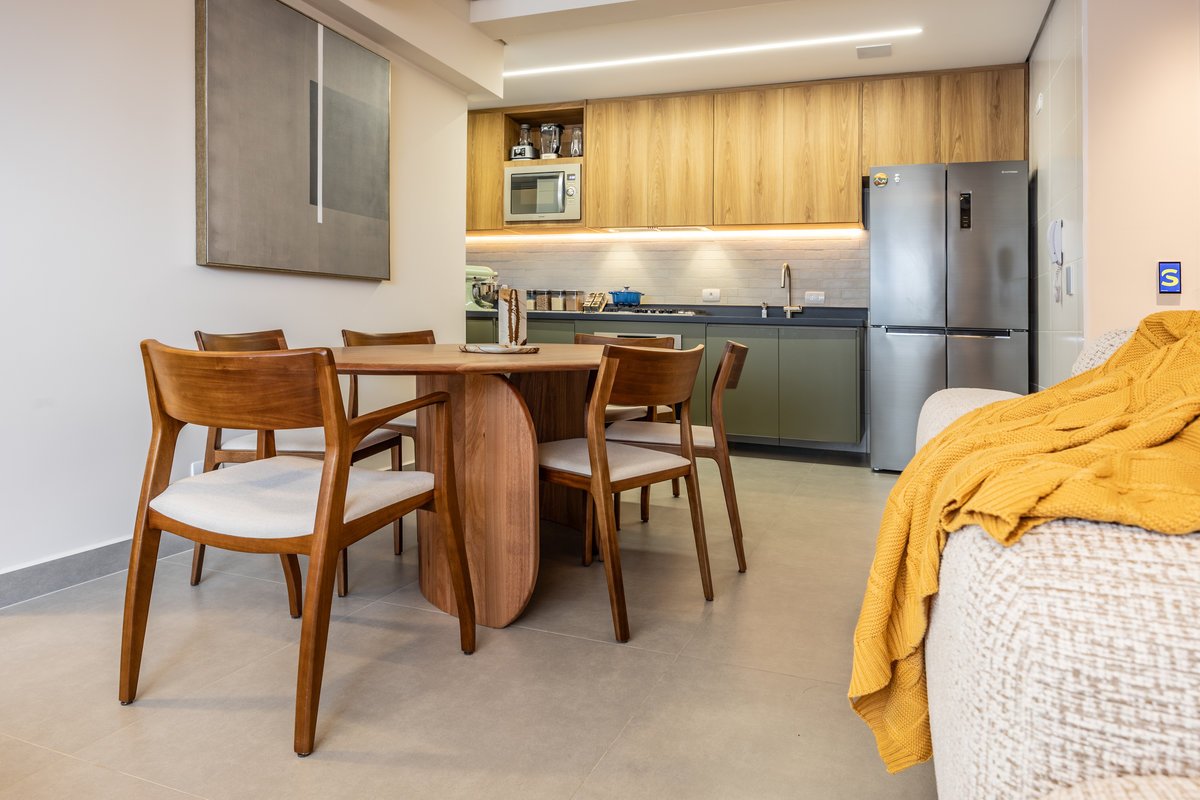 A marcenaria sob medida, com iluminação embutida, organiza sem pesar. Já os estofados generosos e de linhas curvas convidam ao relaxamento e à convivência a dois — seja para maratonar séries ou receber amigos. O painel com estampa geométrica quebra a monotonia com um toque contemporâneo e ousado, sem deixar de lado a elegância. O equilíbrio entre design e funcionalidade é o fio condutor desse refúgio urbano feito sob medida para quem valoriza bem-estar e estilo.